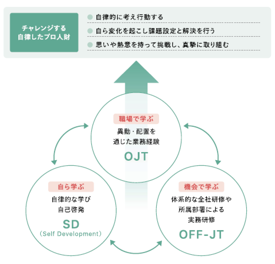 training system三菱食品では、「常に「中核」に向かって自律考動し、果敢に挑戦する人財」の育成を目指し、職場でのOJTを基本としながら、計画的な配置(異動)と体系的な研修を連動させ人財育成を実施しています。